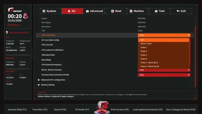 Bo mạch chủ tích hợp nút ép xung X3D One-Click ở mặt sau khu vực I/O, cho phép kích hoạt chế độ tối ưu mà không cần truy cập BIOS. Bên cạnh đó, X3D AI High Frame Rate Mode được tích hợp trực tiếp trong BIOS, hỗ trợ tự động điều chỉnh xung nhịp cơ bản và các thông số PBO, đồng thời cung cấp nhiều cấu hình thủ công để cân bằng giữa hiệu năng và độ ổn định hệ thống.