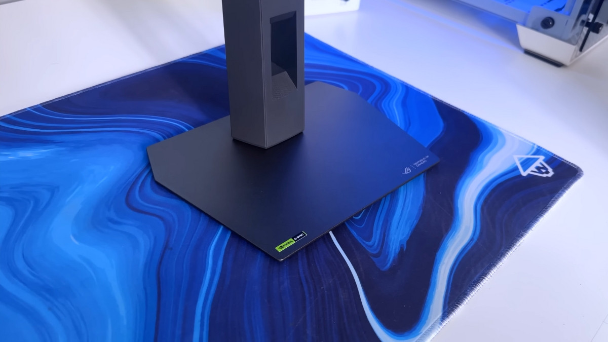 Chân đế ASUS ROG Strix XG32UCWMG gọn hơn 45% so với đời trước, rộng 23cm, giữ màn hình chắc chắn mà vẫn tiết kiệm diện tích bàn.
