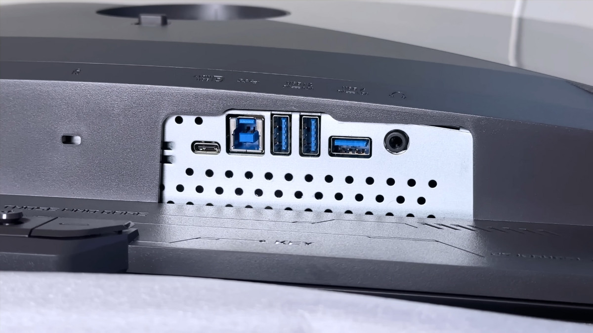 Cổng USB, USB-C và jack 3.5mm trên ASUS ROG Strix XG32UCWMG mở rộng khả năng kết nối, hỗ trợ laptop và các thiết bị ngoại vi.