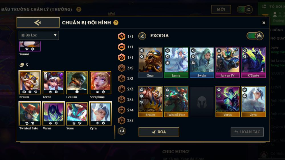 Khung đội hình EXODIA hoàn thiện ở cấp độ 9 sẽ bao gồm: Gnar, Janna, Swain, Jarvan IV, K'Sante, Braum, Twisted Fate, Varus và Zyra. Dưới đây là combo trang bị phù hợp dành cho các tướng chủ lực trong đội hình: