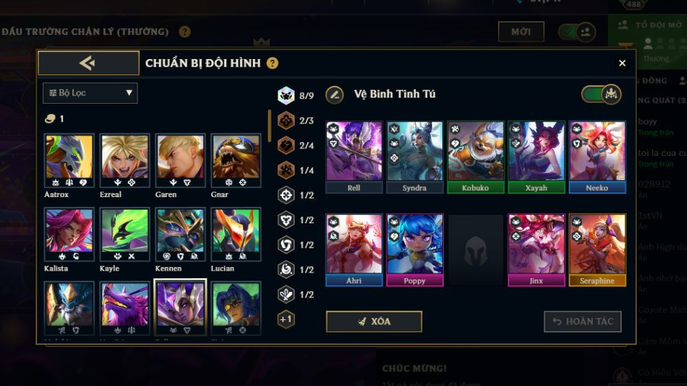 Khung đội hình Vệ Binh Tinh Tú hoàn thiện ở cấp độ 9 sẽ bao gồm: Rell, Syndra, Xayah, Kobuko, Neeko, Ahri, Poppy, Jinx và Seraphine. Dưới đây là combo trang bị gợi ý dành cho các tướng chủ lực trong đội hình: