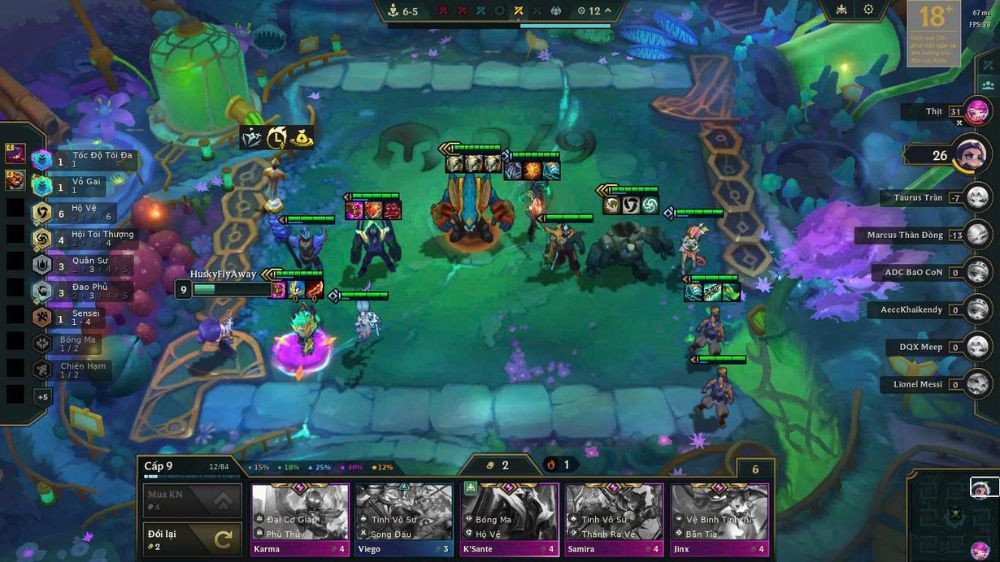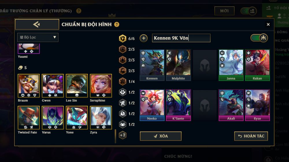 Khung đội hình Kennen Điện 9 Ngàn Vôn hoàn thiện ở cấp độ 8 sẽ bao gồm: Kennen, Malphite, Janna, Rakan, Neeko, K'Sante, Akali và Ryze. Nếu lên được cấp 9 hãy bổ sung thêm Gwen để tăng sát thương cho tuyến sau của đội hình.
