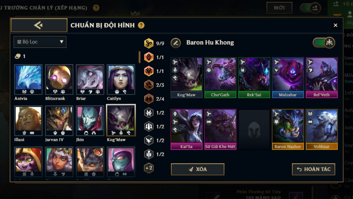 Khung đội hình Baron Hư Không hoàn thiện ở cấp độ 10 sẽ bao gồm: Kog'Maw, Cho'Gath, Rek'Sai, Malzahar, Bel'Veth, Kai'Sa, Sứ Giả Khe Nứt, Baron Nashor và Volibear. Bên cạnh Volibear thì Fiddlesticks hay Shyvana cũng là một lựa chọn khá lý tưởng để bổ sung thêm sức mạnh cho đội hình.