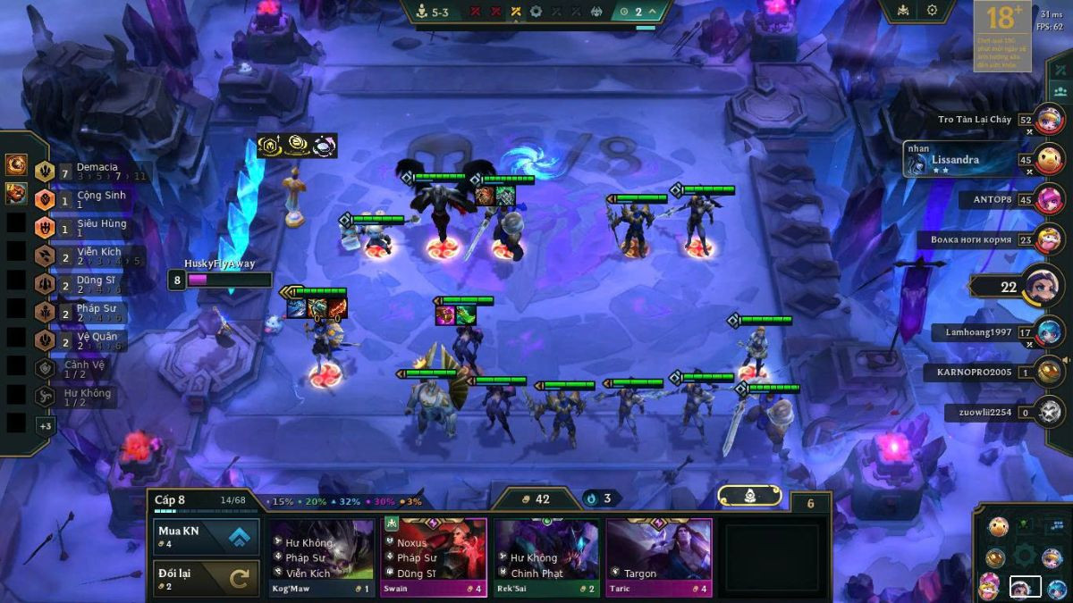 Sau khi nâng cấp xong Vayne, hãy lập tức đẩy lên cấp 8. Đây là thời điểm đội hình tăng tiến sức mạnh rõ rệt khi bạn có thể đồng loạt mở khóa Kai’Sa và Galio. Tiếp đó, hãy bán Caitlyn và Loris, thay thế bằng Lux, Swain và Kai’Sa để hoàn thiện khung đội hình chính.