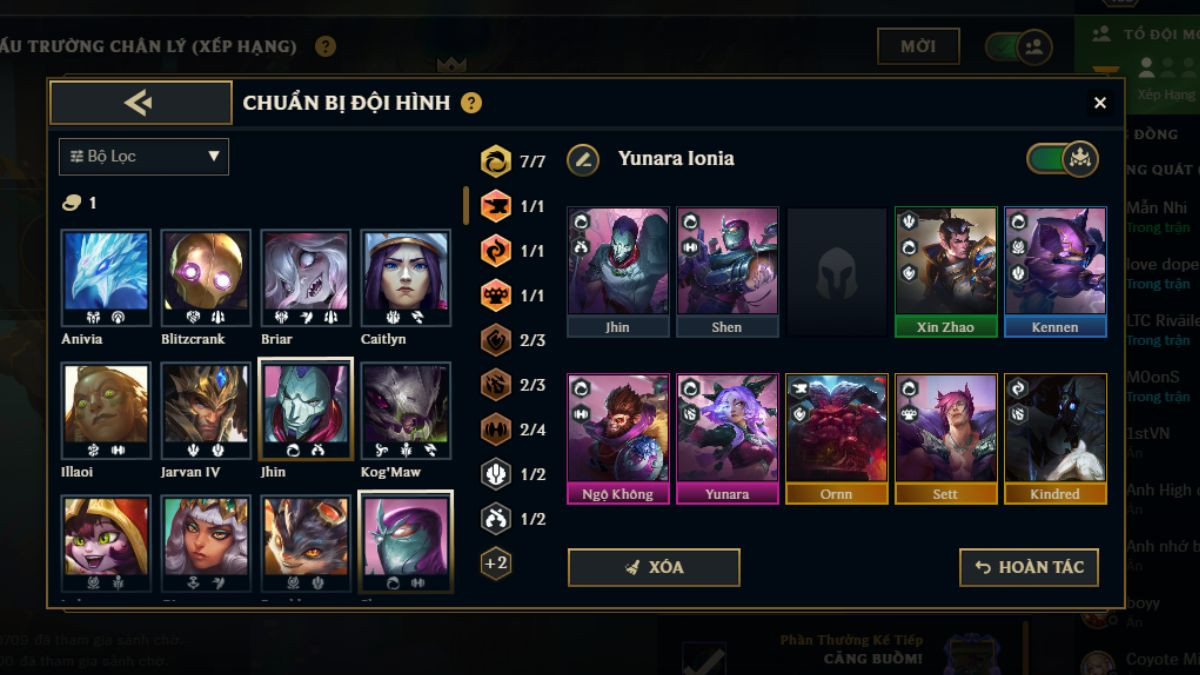 Đây là đội hình vừa dễ xoay, vừa sở hữu khả năng lọt top cực cao trong giai đoạn giữa và cuối trận. Khung đội hình Yunara Ionia hoàn thiện ở cấp độ 9 sẽ bao gồm: Jhin, Shen, Xin Zhao, Kennen, Ngộ Không, Yunara, Ornn, Sett và Kindred. Dưới đây là combo trang bị đề cử dành cho các chủ lực: