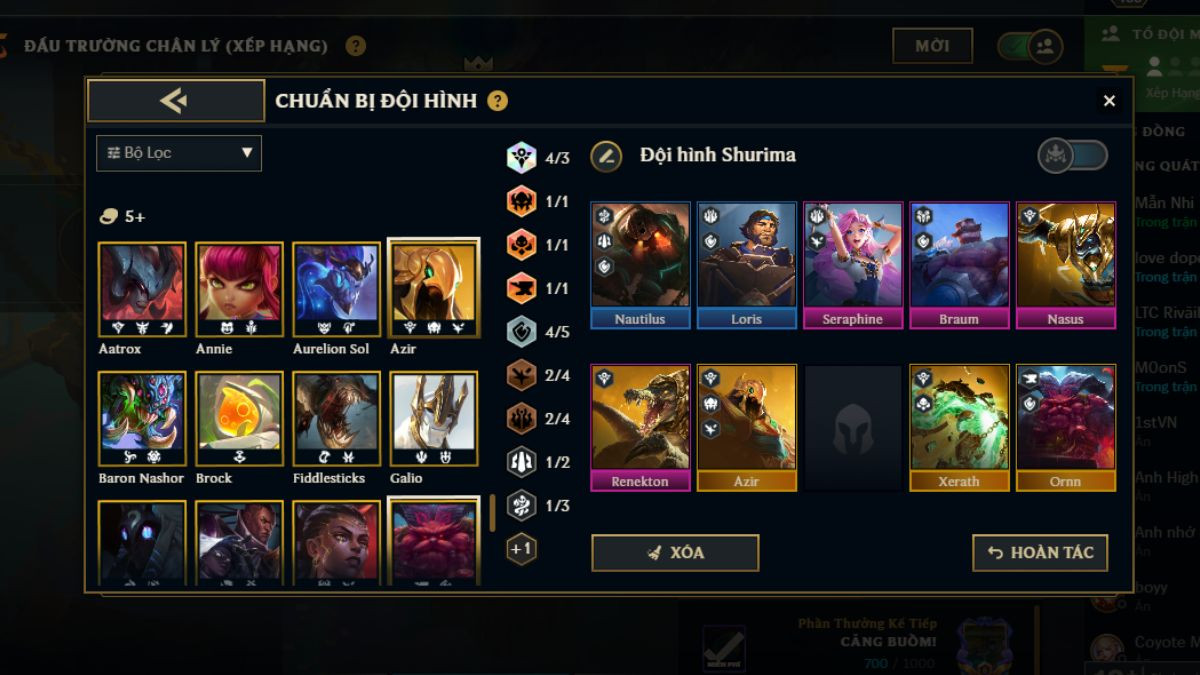 Khung đội hình Shurima hoàn thiện ở cấp độ 9 sẽ bao gồm: Nautilus, Loris, Seraphine, Braum, Nasus, Renekton, Azir, Xerath và Ornn. Dưới đây là combo trang bị tốt nhất dành cho các chủ lực: