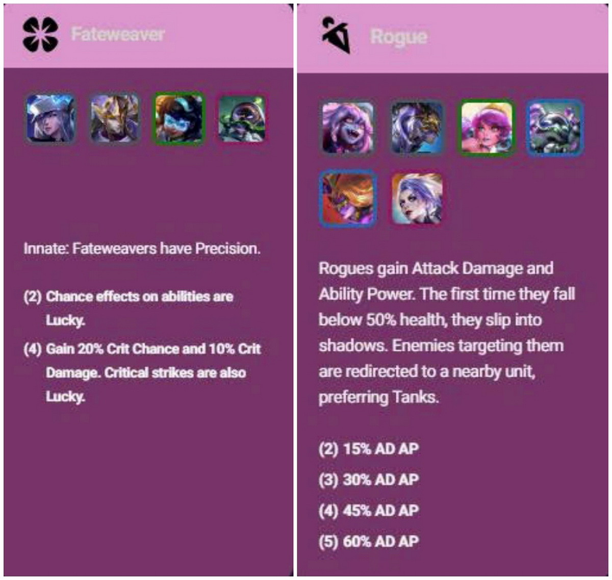 Hiệu ứng của hai hệ Fateweaver và Rogue trong Đấu Trường Chân Lý mùa 17.