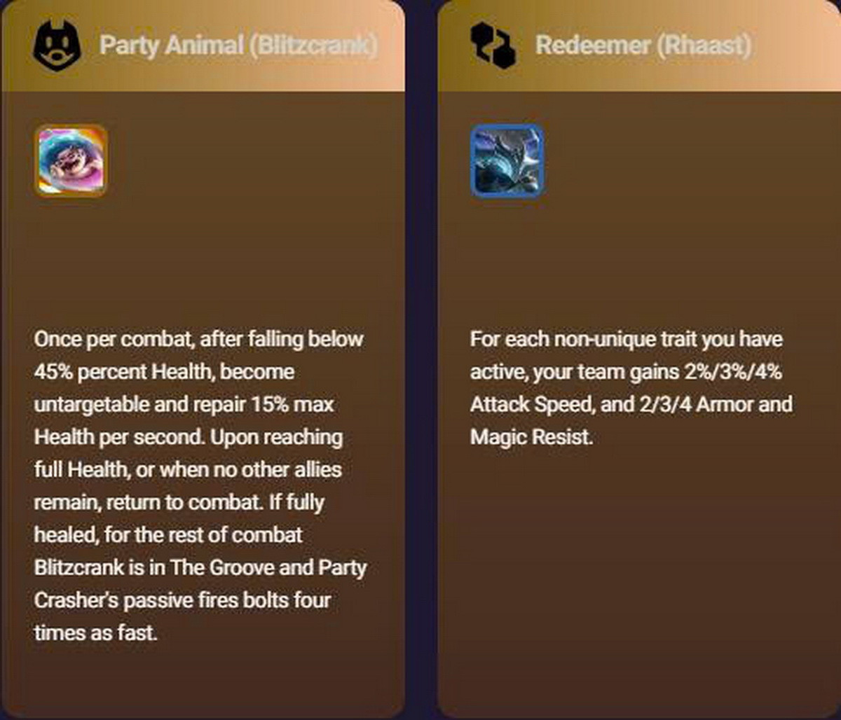 - Tiệc Tùng (Blitzcrank): Khi dưới 45% Máu, trở nên vô hình và hồi 15% Máu mỗi giây; sau đó lao vào giao tranh với tốc độ cao và kỹ năng được cường hóa.