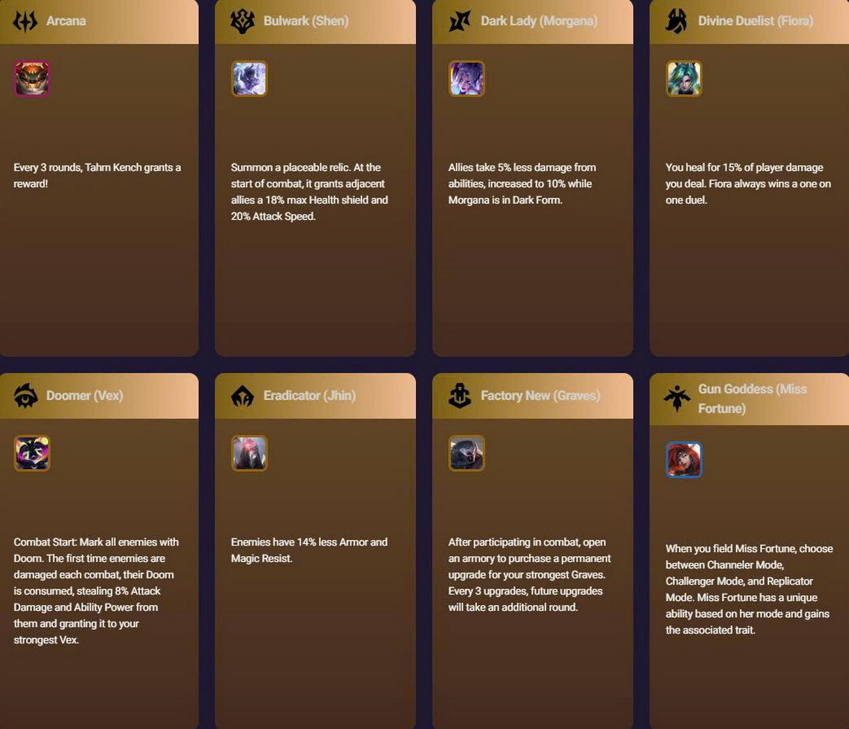 - Quý Cô Bóng Tối (Morgana): Đồng minh gây ít hơn 5% sát thương từ kỹ năng; mức giảm tăng lên 10% khi Morgana ở trạng thái Bóng Tối.