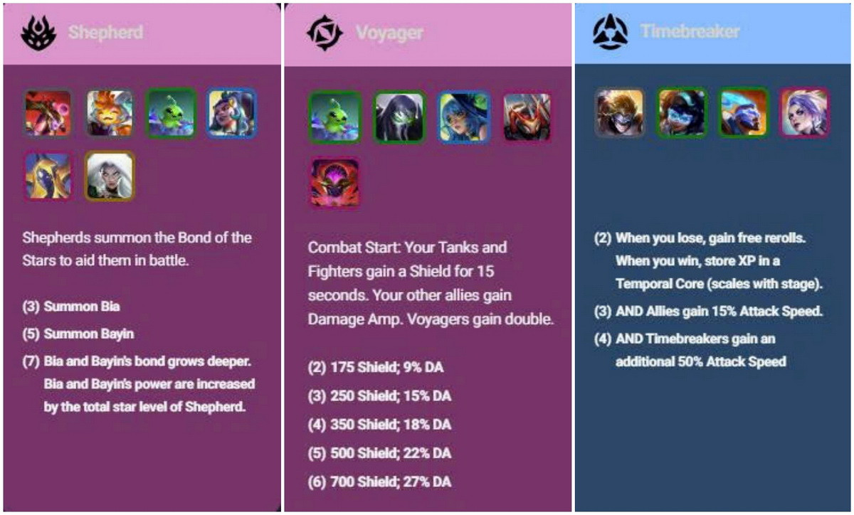 Hiệu ứng của ba hệ Sheperd, Voyager và Timebreaker trong Đấu Trường Chân Lý mùa 17.