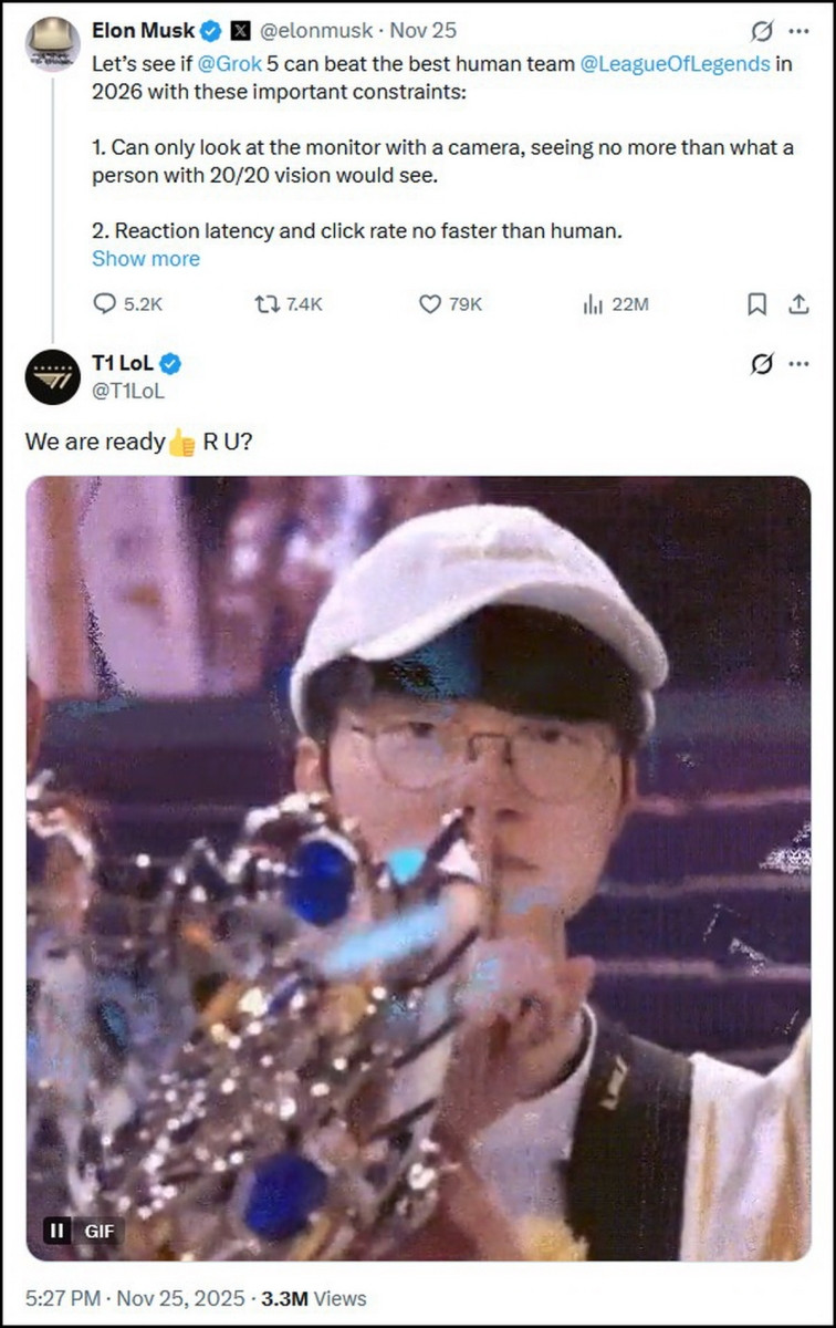 Ngày 25/11 vừa qua, tỷ phú Elon Musk bất ngờ tuyên bố trên X về kế hoạch tổ chức một trận đấu Liên Minh Huyền Thoại giữa người và máy vào năm 2026. Đối thủ của trí tuệ nhân tạo Grok 5 do công ty xAI của ông phát triển sẽ là "đội tuyển Liên Minh Huyền Thoại xuất sắc nhất của con người" – không ai khác ngoài T1.