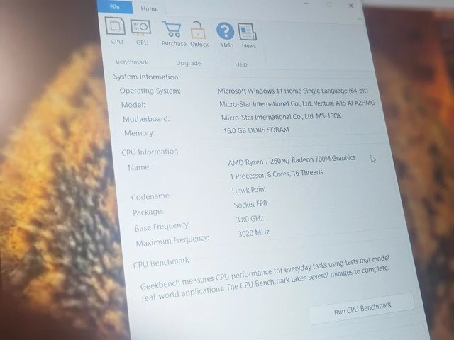 Đây có lẽ là điểm đầu tiên khiến nhiều người phải tò mò về MSI Venture A15 AI. "Bộ não" của chiếc máy này là bộ vi xử lý AMD Ryzen 200 Series mới (Ryzen 7 260), sử dụng dây chuyền 4nm cao cấp và kiến trúc Zen 4 với tối đa 8 nhân 16 luồng. Qua trải nghiệm thực tế, con chip này xử lý mượt mà mọi tác vụ, từ công việc văn phòng cơ bản cho đến các tác vụ chuyên sâu hơn như lập trình hay chỉnh sửa video.