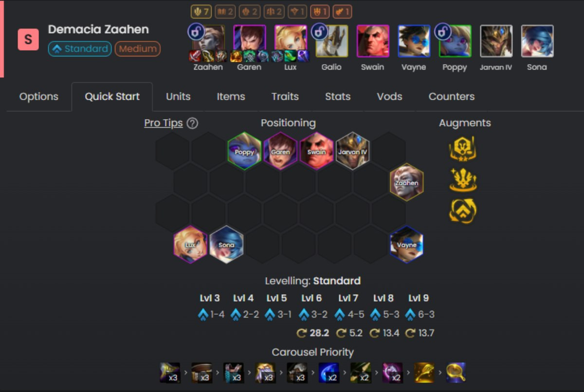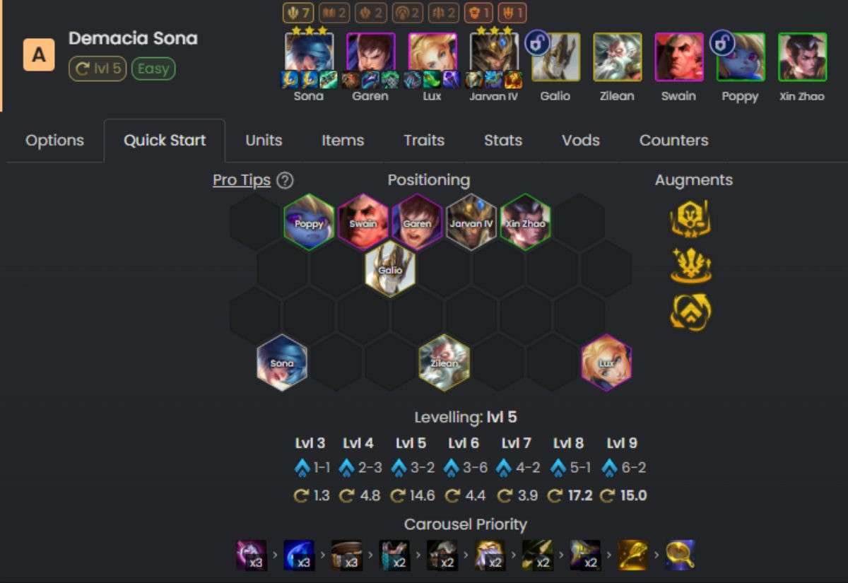 Đội hình này sẽ tròn form ở cấp độ 8 với 9 tướng, sau khi bạn đã mở khóa cho mình Galio ở mốc 12 sao tướng Demacia. Ngoài Sona, Zilean và Lux sẽ là hai carry phụ có thể cầm đồ dựa trên tình huống trận đấu.