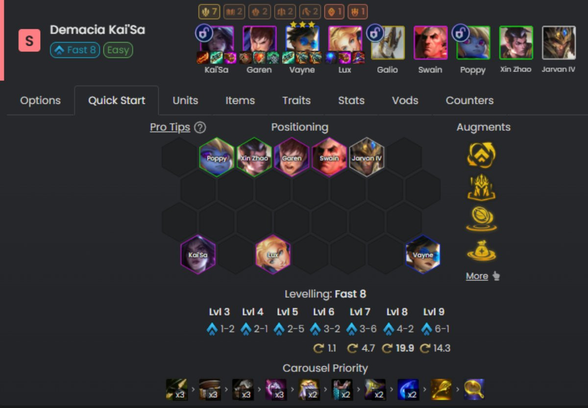 Sau bản cập nhật thứ 2 của ĐTCL mùa 16, Kaisa trở thành một carry hot meta có thể kẹp và sử dụng trong rất nhiều biến thể đội hình khác nhau, và Demacia cũng không phải ngoại lệ. Với việc đã có sẵn Vayne trong đội, mốc Viễn Kích sẽ được kích hoạt sớm, và bạn cũng có thể dễ dàng mở khóa được Ái Nữ Hư Không từ rất sớm nếu fast 8 và sở hữu cho mình một chiếc lõi kinh tế.