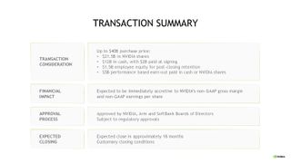Sau nhiều tháng suy đoán và báo cáo ngày hôm qua rằng một thỏa thuận sắp xảy ra , Nvidia hôm nay đã thông báo rằng họ đang mua lại ARM Limited từ SoftBank trong một giao dịch trị giá 40 tỷ đô la. SoftBank "sẽ vẫn cam kết đối với thành công lâu dài của Arm thông qua cổ phần sở hữu của mình tại NVIDIA, dự kiến dưới 10%", báo hiệu rằng Nvidia sẽ giành toàn quyền kiểm soát ARM. Tuy nhiên, giao dịch không bao gồm Nhóm dịch vụ IoT của ARM, vẫn thuộc SoftBank. Thỏa thuận này được xếp hạng là thương vụ mua lại chất bán dẫn lớn nhất trong lịch sử và đánh dấu thương vụ mua lại công nghệ lớn thứ hai trong lịch sử sau thương vụ mua EMC trị giá 64 tỷ USD của Dell. Theo dự kiến, thỏa thuận ARM / Nvidia sẽ phải được phê duyệt theo quy định và có thể mất tới 18 tháng để hoàn thành. Những người được cấp phép hiện tại của ARM bao gồm các nhà lãnh đạo trong ngành như Apple, Qualcomm, Amazon và Samsung, trong số nhiều công ty khác, và vẫn còn phải xem các công ty đó sẽ phản ứng như thế nào với việc mua lại.
