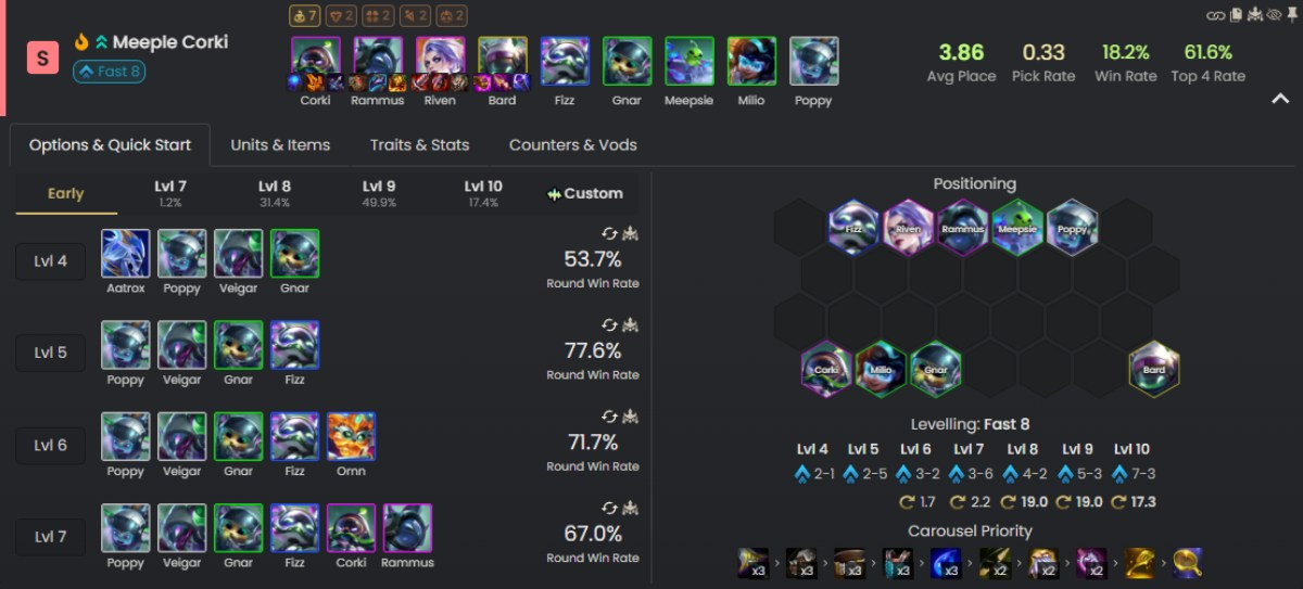 Đã có reroll và Exodia rồi thì chắc chắn chúng ta không thể bỏ qua một bộ cờ fast 8 đánh giữa game thật chất lượng. Và sau rất nhiều trận thử nghiệm, Duy Hưng Computer quyết định lựa chọn giáo án Meeple Corki - với nguyên do chính là vì bộ cờ này có độ khó không cao, cực kỳ đa dụng và đặc biệt là ngưỡng sức mạnh vô cùng ổn định khi vào form.