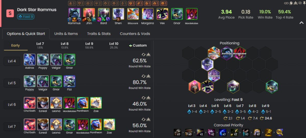 Nếu bạn là một tín đồ của lối chơi fast 9, ngậm đắng nuốt cay để hủy diệt mọi đối thủ về sau thì Rammus Hắc Tinh là đội hình sinh ra dành cho bạn. Với rất nhiều vị tướng 4, 5 vàng, đội hình này mang lại sức mạnh tổng thể cực kỳ khủng khiếp, mặc dù độ khó để chơi được tròn form và yêu cầu kỹ năng đối với người chơi cũng khá khắt khe.
